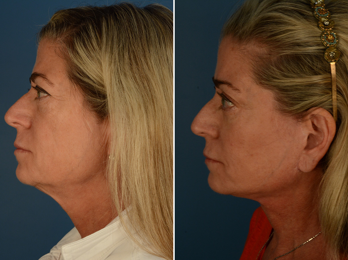 This is a 58 year old woman with a history of prior upper and lower eyelid blepharoplasty who consulted with facelift specialist, Dr. Anurag Agarwal, for his recommendations for facial rejuvenation. She is shown before and 1.5 years after Dr. Agarwal performed cheek augmentation with cheek implants (large on her right and small on her left), UpliftTM lower face and neck lift with platysmaplasty and submandibular gland reduction, endoscopic forehead and brow lift, transconjunctival lower blepharoplasty, fat transfer to tear troughs and infraorbital rims, fractional CO2 laser resurfacing of the lower eyelids, and TCA peel around the mouth.